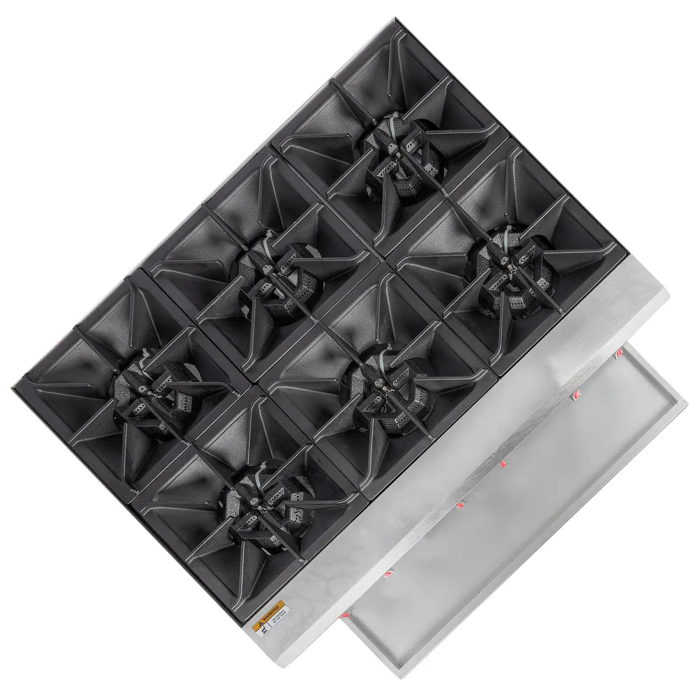 Featuring six high-output burners, each producing 30,000 BTU, this hotplate provides a total of 180,000 BTU—perfect for handling multiple dishes simultaneously during peak service hours. The heavy-duty cast iron grates ensure durability and even heat distribution, while independent controls allow precise temperature adjustment for each burner.